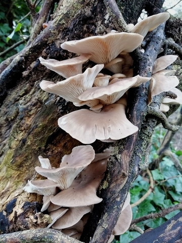 Oyster mushrooms are shell shaped fungi that grow in tiers or fabulous clusters on dead trees or stumps. Unlike many fungi, these mushrooms are not seasonal and can be found all year round, especially after a cold snap which can trigger the fungus into fruiting.